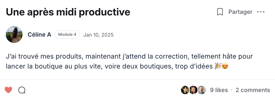 "J'ai suivi beaucoup de formations en e-commerce, mais celle-ci est la seule qui m'a vraiment apporté des résultats. Au-delà de la théorie, le côté pratique et le coaching font toute la différence."