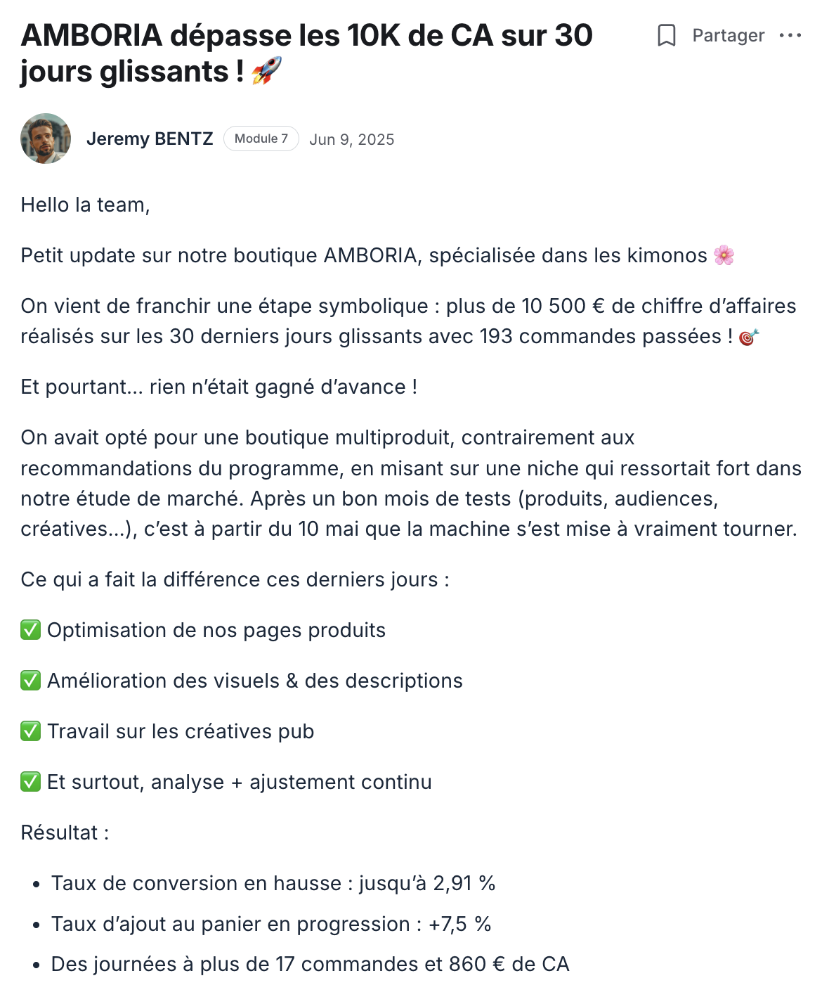 Comment Julia et Jérémy ont dépassés les 10 000 € de chiffre d'affaires en 30 jours, avec des journées à plus de 1 200 € de ventes.